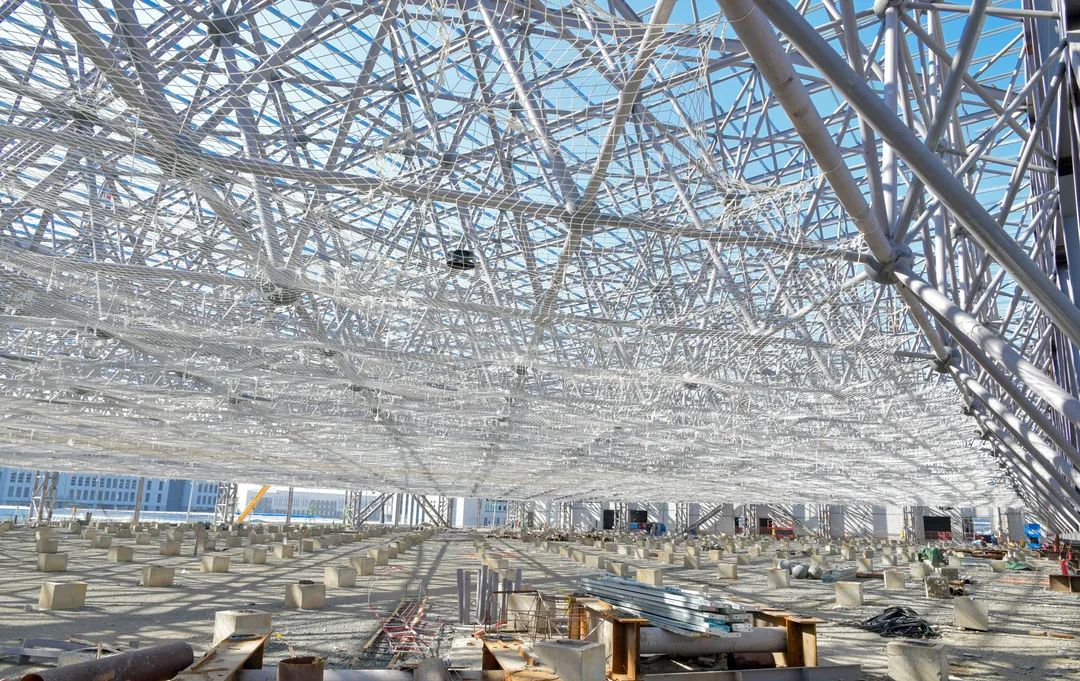 烏魯木齊機(jī)場(chǎng)改擴(kuò)建項(xiàng)目機(jī)務(wù)區(qū)工程用地總面積41883㎡,建筑面積16922.13㎡。其中維修機(jī)庫(kù)16674.62㎡,機(jī)庫(kù)大廳結(jié)構(gòu)形式為鋼管混凝土組合柱及鋼網(wǎng)架結(jié)構(gòu),鋼網(wǎng)架結(jié)構(gòu)跨度144米,機(jī)庫(kù)進(jìn)深80米,高39米。建成后將是疆內(nèi)跨度最大的單體建筑,為“新疆第一跨”,可同時(shí)容納兩架波音787-9型飛機(jī)或6架波音737-800型飛機(jī)入庫(kù)維修。