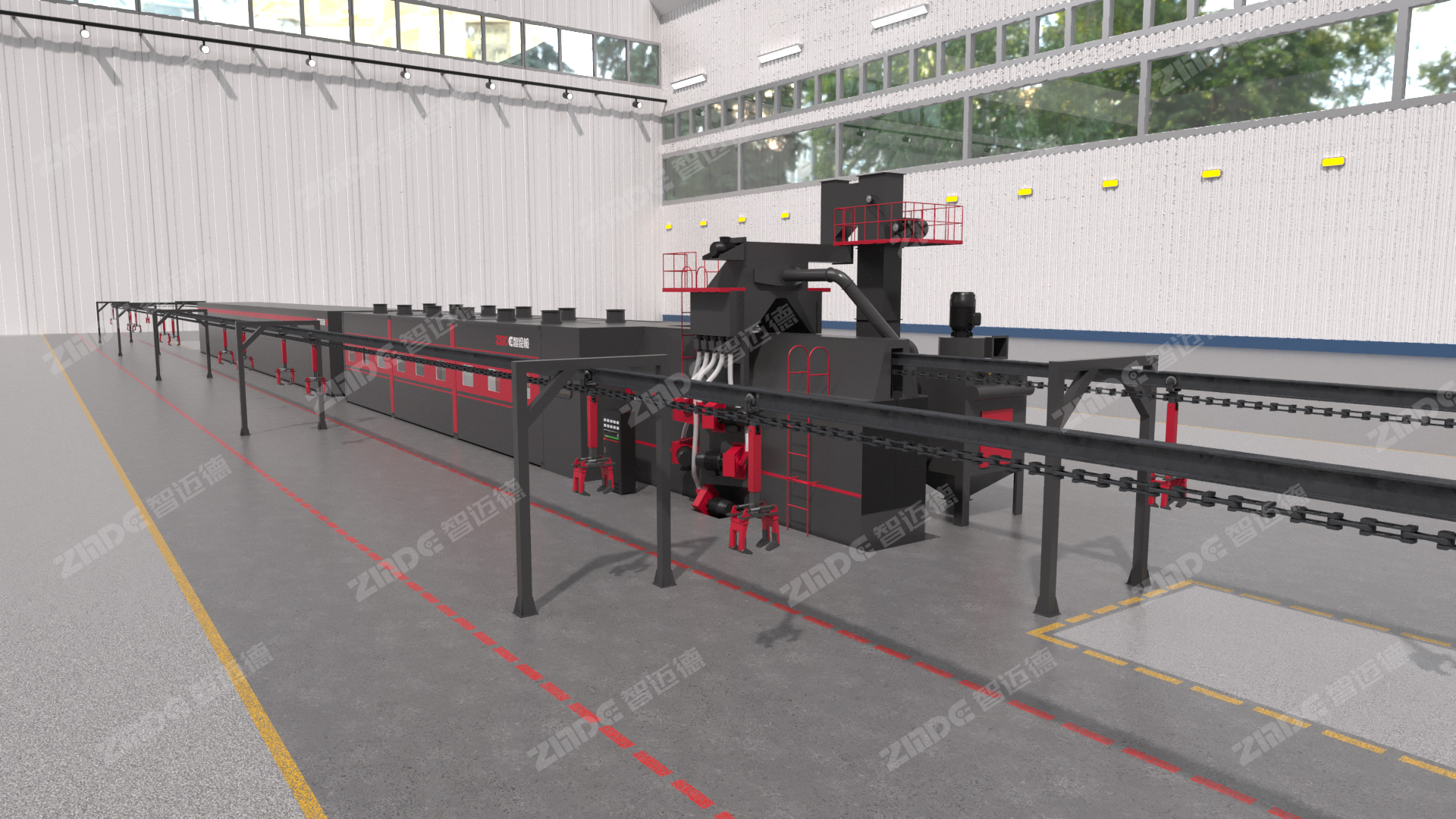 智涂懸鏈?zhǔn)綊亣娨惑w生產(chǎn)線是智邁德研發(fā)生產(chǎn)的一款集拋丸、掃描、噴涂、烘干于一體的自動(dòng)化設(shè)備,該設(shè)備通過(guò)懸鏈輸送構(gòu)件,專用于鋼構(gòu)件表面的噴漆處理,該產(chǎn)線系統(tǒng)解決了人工噴涂存在的勞動(dòng)強(qiáng)度高、環(huán)境差、效率低、費(fèi)工費(fèi)料、涂層質(zhì)量不穩(wěn)定等問(wèn)題??梢詫?shí)現(xiàn)智能上料、自動(dòng)識(shí)別、智能行走噴涂、智能控溫烤漆等,具有省人工、低勞動(dòng)強(qiáng)度、效率高、涂層勻等優(yōu)點(diǎn),是鋼結(jié)構(gòu)加工行業(yè)高效智能的先進(jìn)裝備。